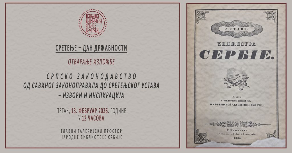 Данас, 13. 2. 2026. године, уочи државног празника Сретење отворена је изложба Српско законодавство од Савиног Законоправила до Сретенског устава – извори и инспирација у главном галеријском простору Народне библиотеке Србије. Присутнима се обратила в.д. управнице Народне библиотеке Србије госпођа Јасмина Нинков, а у име аутора говорио је господин Душан Злоколица, уредник културних програма Народне […]