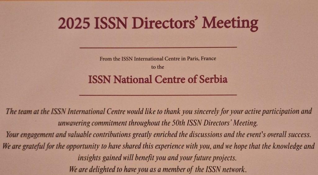 У Националној библиотеци Француске је од 6-10. октобра организована конференција директора националних ИССН центара поводом 50 година од оснивања ИССН интернационалног центра у Паризу. Конференцији је присуствовала Јасмина Нинков в.д.управник Народне библиотеке Србије. ИССН центар за Србију ради у оквиру Народне библиотеке Србије.
